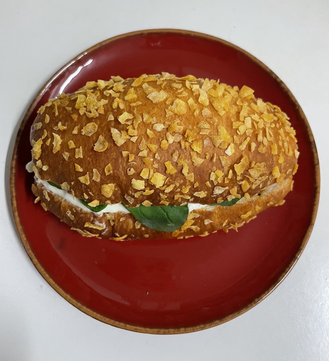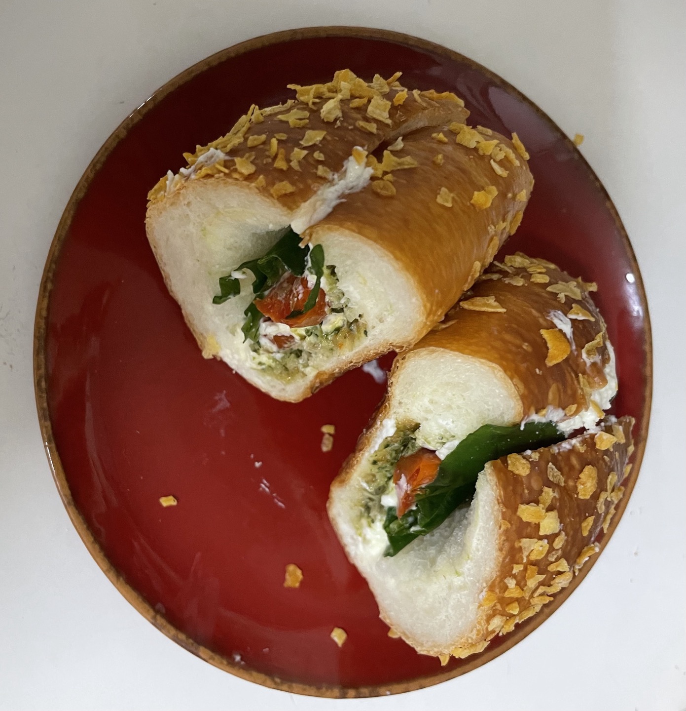 소금빵에 바질과 토마토와 크림치즈를 넣어 만든 빵으로 지중해식 풍미를 느낄 수 있습니다.