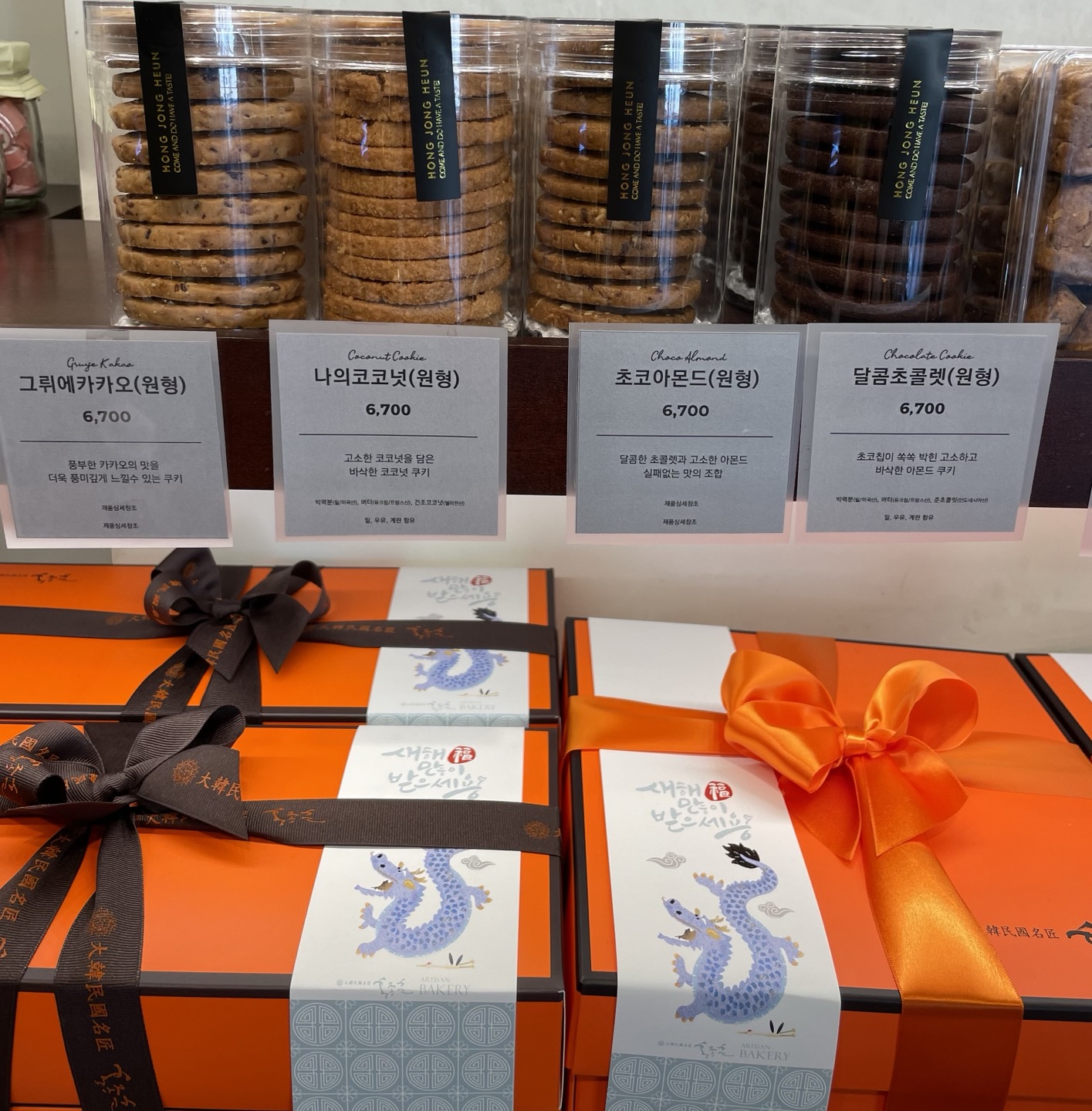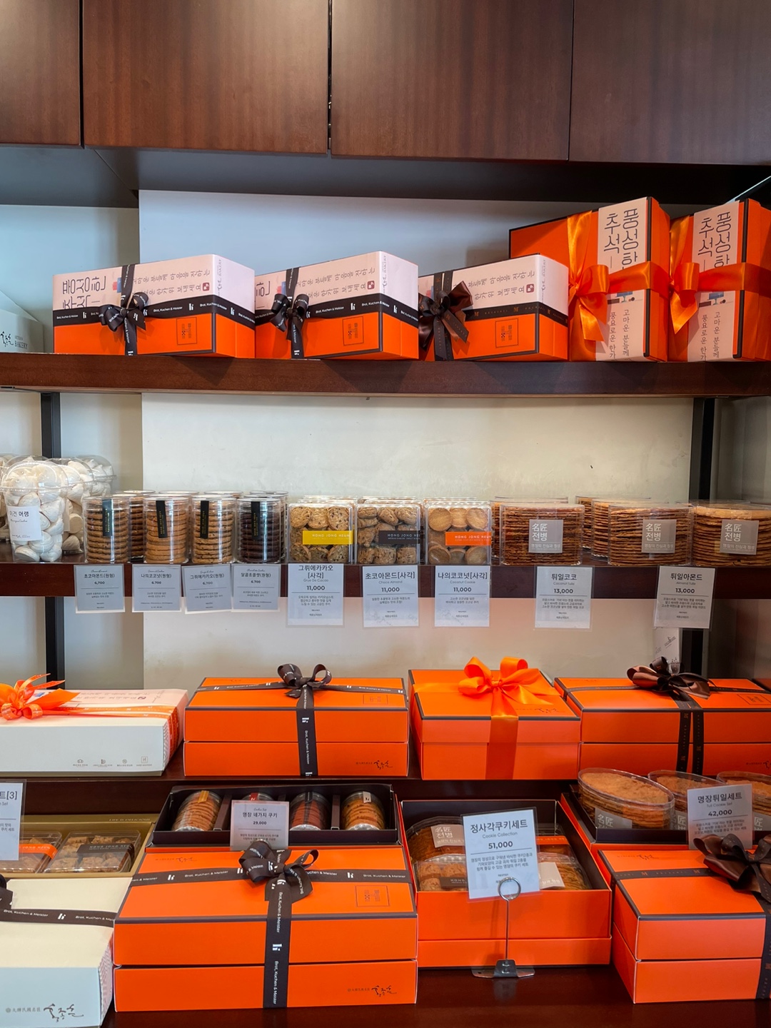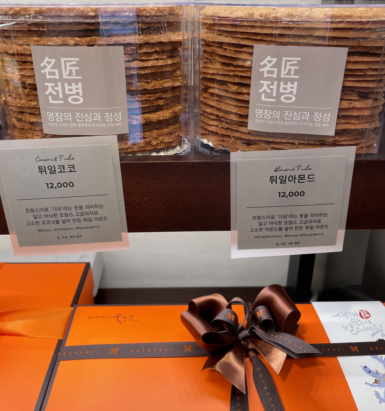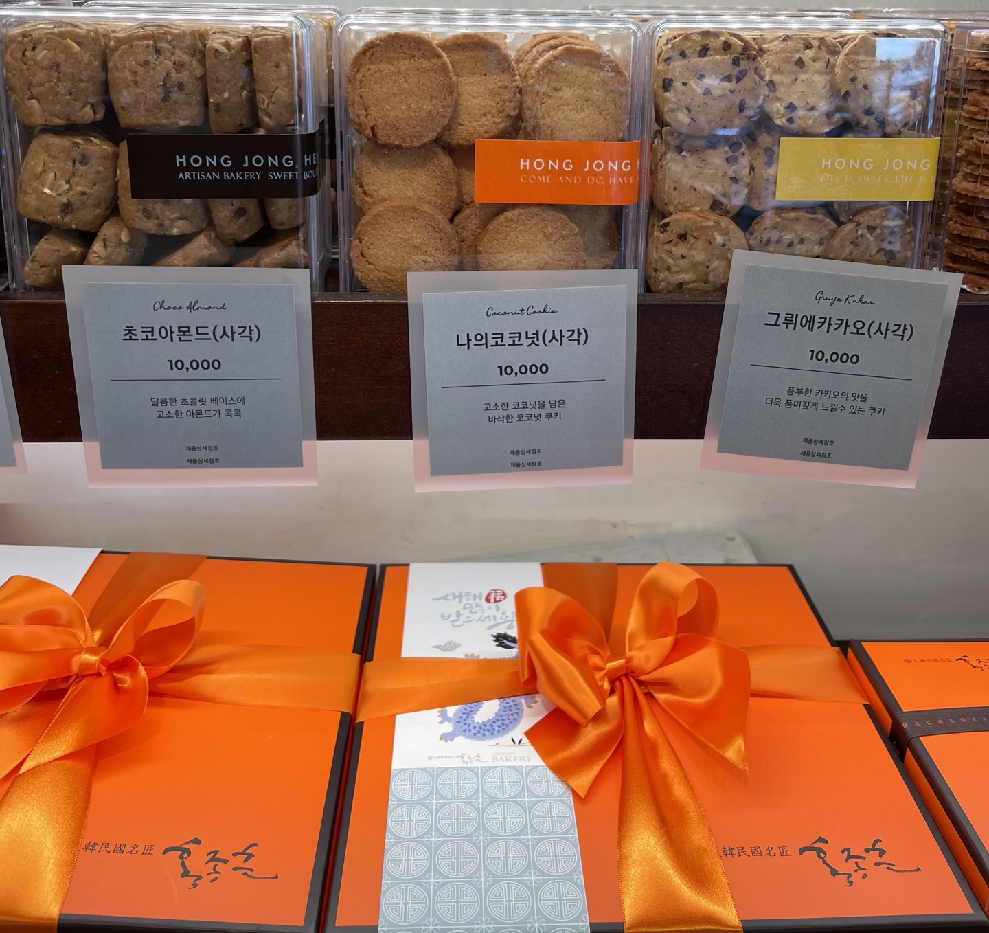 홍종흔 베이커리 반포점에는 들어가서 오른쪽 매데에 주황색 박스들이 분홍색 추석 감사 선물세트로 예쁘게 단장을 하고 기다리고 있어요. 명장의 4가지 쿠키와 전병세트(명장 튀일세트)를 추천드려요. 정사각 쿠키와 전병을 반반씩 담아 구성한 정사각 쿠키 세트도 고급스러워 받으시는 분들이 아주 만족해하세요.